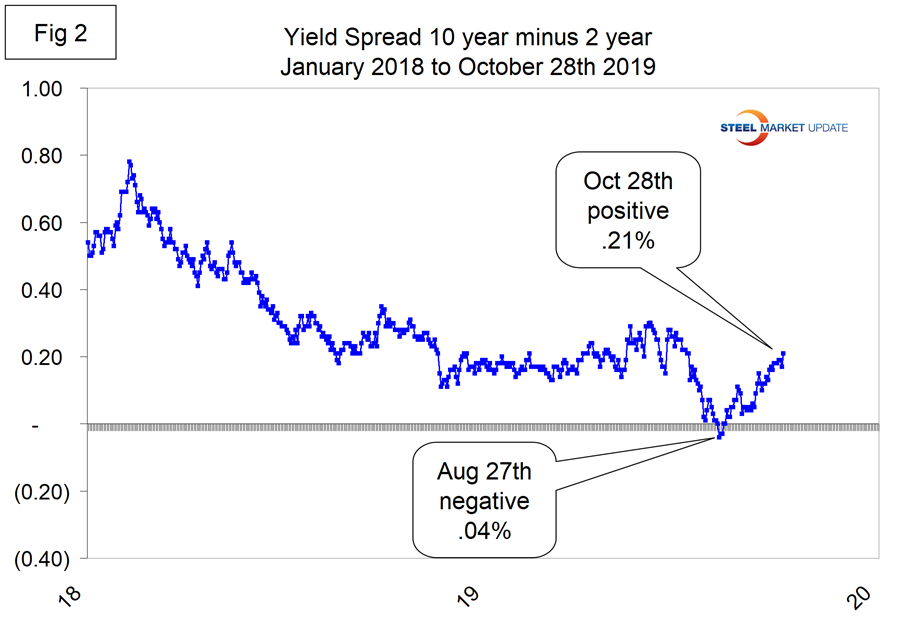 We make special mention of the Treasury yield spread here because the 10-year minus two-year dipped into negative territory for three days at the end of August. Historically, a negative yield spread has been a predictor of recession within 18 months. On Oct. 28, the value was positive 0.21 percent (Figure 2). The negative duration was so short and the negativity so small that maybe we have dodged the recession prediction for now. The last time the 10/2 spread was negative was June 6, 2007.