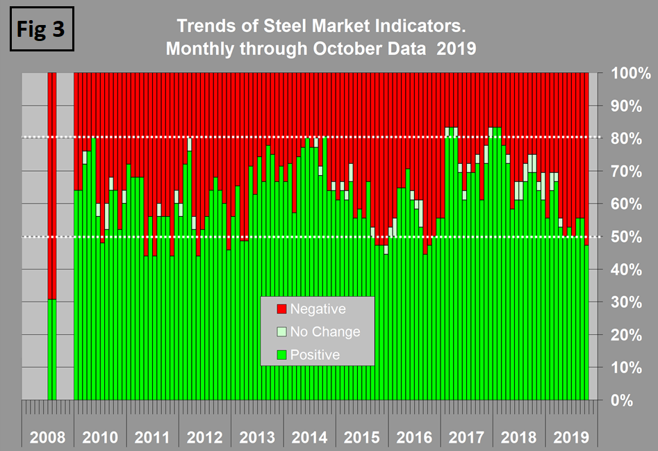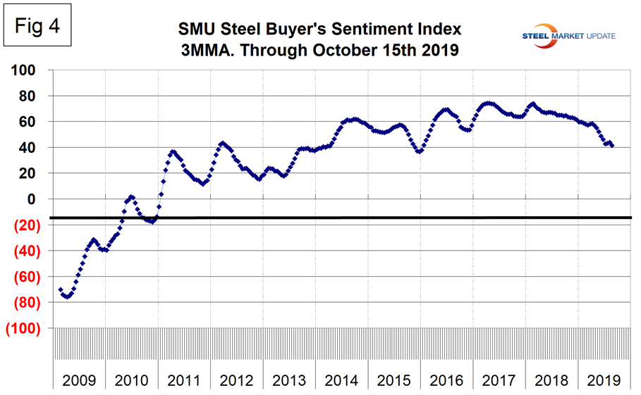 As a reality check for this report we include here Figure 4, which is SMU’s Steel Buyers Sentiment index. Readings are developed during the twice monthly SMU market surveys. SMU Steel Buyers Sentiment is a measure of the current attitude of North American buyers and sellers of flat rolled products regarding their company’s opportunity for success in today’s market. A reading above the neutral point of zero indicates that a preponderance of buyers have a positive attitude. The index has been deteriorating since mid-February last year. The mid-October value was still positive 41.3, down from a peak of 73.8 in February 2018. This is a three-month moving average, which obscures the fact that the standalone mid-October result experienced a significant decline to the least optimistic result in nearly six and a half years. This measure is more current than the majority of the 36 indicators considered in this study, so is definitely a cause for concern.