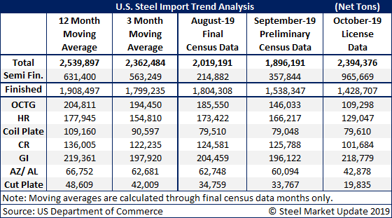 U.S. steel imports likely totaled around 2.4 million tons in October, near the 12-month average, based on the latest import license data from the Department of Commerce. Imports of semifinished steel approached a million tons as the mills moved to secure slabs in the first month of the fourth quarter. Slab imports, notably from Brazil, are subject to quarterly quota limits.