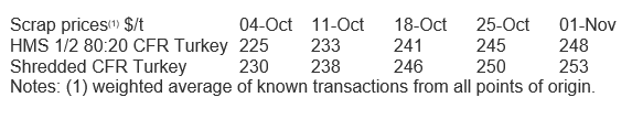 Last week, Turkish scrap import prices were assessed at $248 /t CFR for HMS 80:20. Only one deal was assessed from Europe, after strong restocking activity over recent weeks. Prices have been rising in recent weeks as sellers have pushed for gains as it had become uneconomic to supply at the lower prices of early October. Turkish mills have been able to accept this as they have been able to lift steel export prices to almost the same degree.