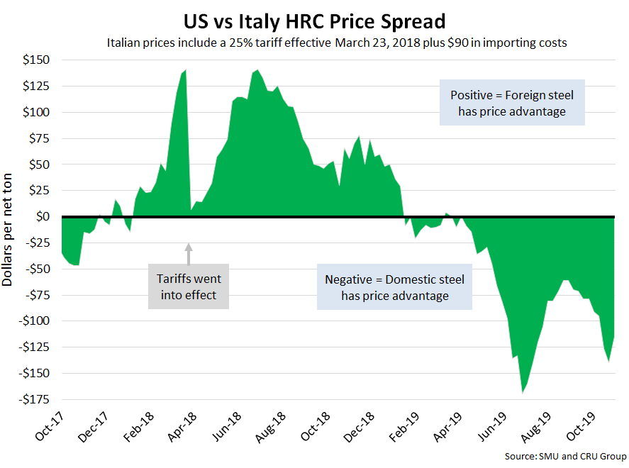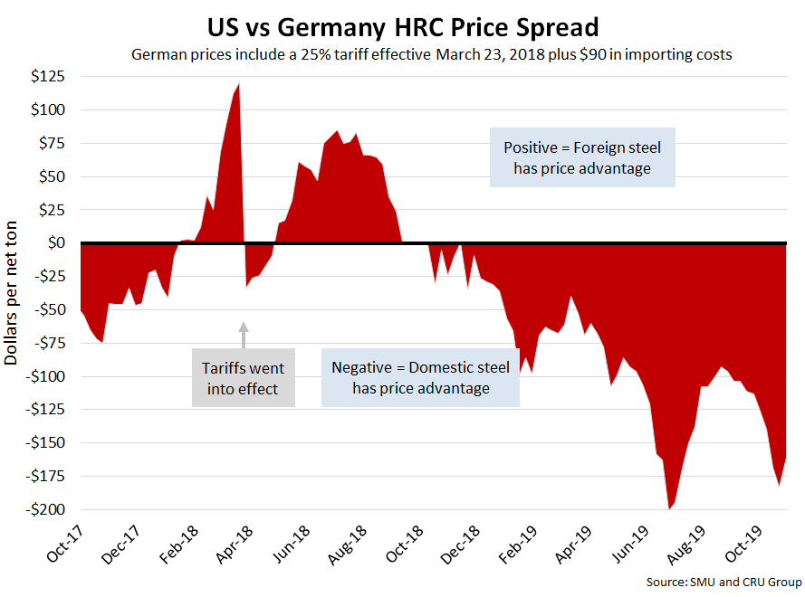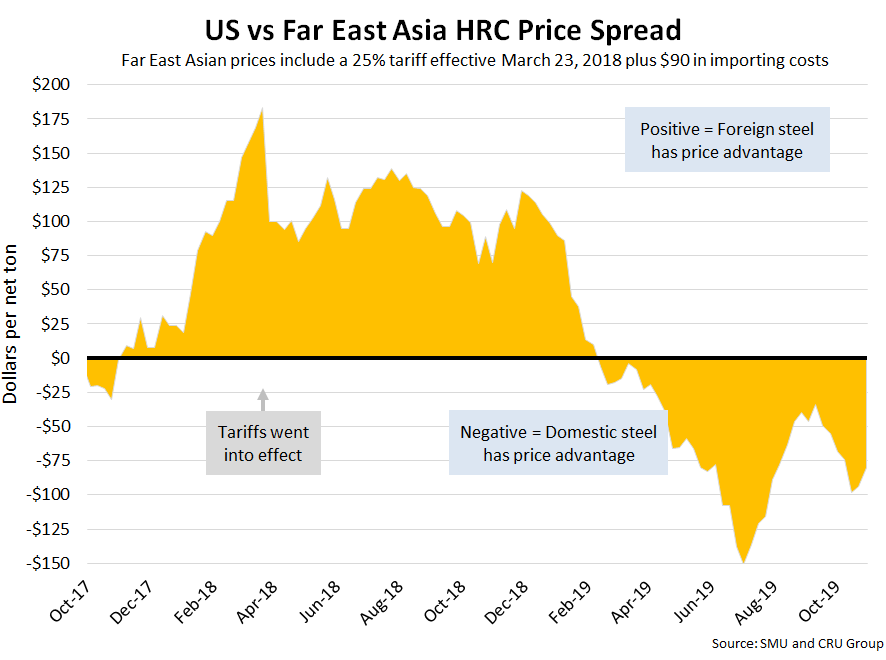 SMU includes a 25 percent import tariff effective on foreign prices after March 23, 2018. We then add $90 per ton to the foreign prices in consideration of freight costs, handling, trader margin, etc., to provide an approximate “CIF U.S. ports price” that can be compared against the SMU U.S. hot rolled price. Note that we do not include any anti-dumping (AD) or countervailing duties (CVD) in this analysis.