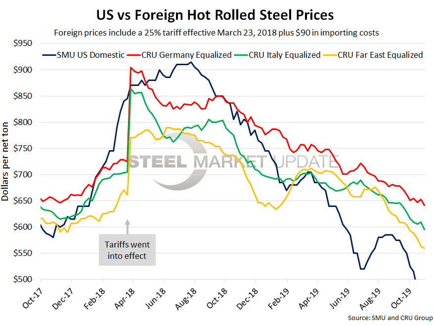 As of Wednesday, Oct. 30, the CRU German HRC price was $441 per net ton, down $9 from the previous week and down $5 from two weeks prior. Adding tariffs and import costs, that puts the German price at $641 per ton delivered to the U.S. The latest SMU hot rolled price average is $480 per ton, up $10 over last week and unchanged from two weeks prior. Therefore, domestically sourced HRC is theoretically $161 per ton cheaper than imported German HRC; the spread was $183 last week and $168 two weeks ago. U.S. prices have have held this advantage for 50 consecutive weeks now.