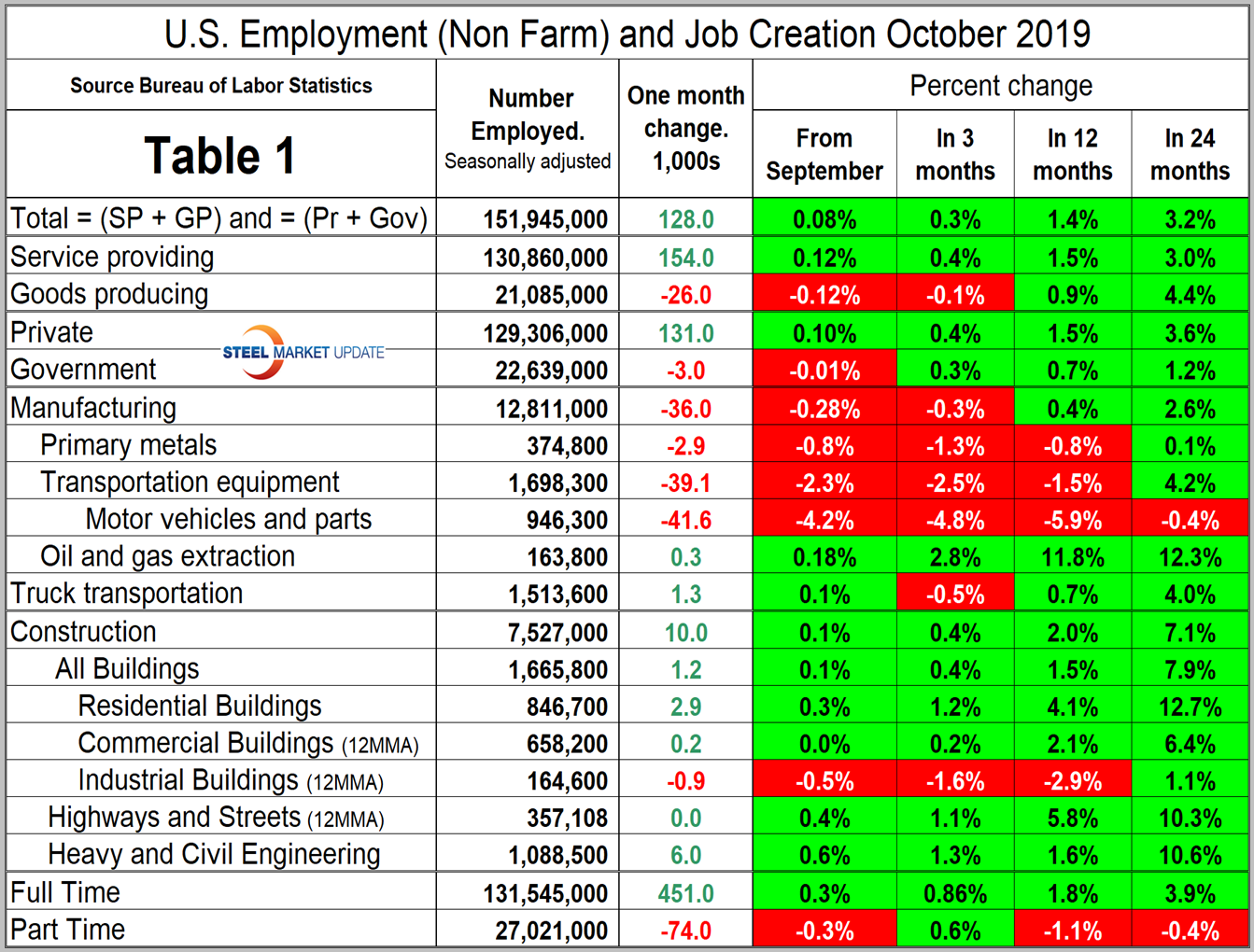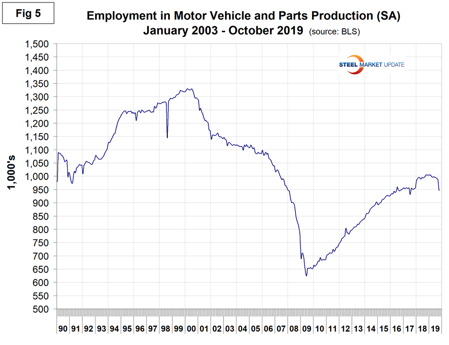 SMU Comment: The GM strike hit the manufacturing component of job creation in October, which distorted the data. Primary metals industries have lost jobs in each of the last seven months for a total of 8,400 positions. This trend was well underway before the GM strike and it is clear that this important economic indicator is a measure of the slowdown in steel consumption.