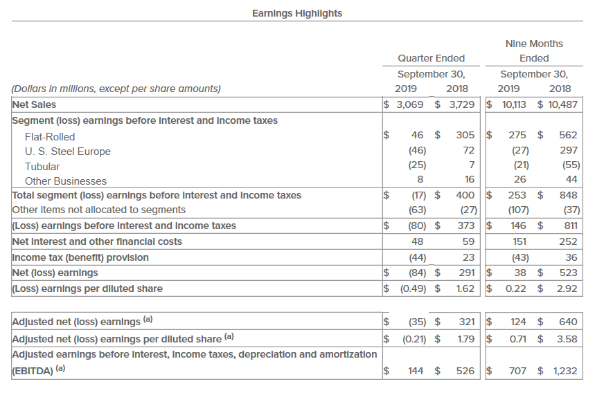 United States Steel Corp. reported a net loss of $84 million in the third quarter due to declining steel prices and weaker market conditions—down sharply compared with third-quarter 2018 yet better than analysts’ expectations. The steelmaker earned $291 million in last year’s third-quarter.