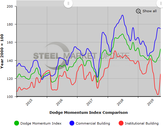 Below is a graph showing the history of the Dodge Momentum Index. You will need to view the graph on our website to use its interactive features; you can do so by clicking here. If you need assistance logging in to or navigating the website, please contact us at info@SteelMarketUpdate.com.