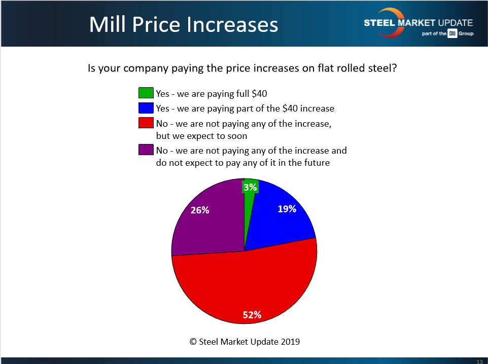 Will the market accept the recent price increases—a total of $80 on flat rolled and $40 on plate? Obviously much depends on steel demand. Judging by the responses from steel buyers polled this past week by Steel Market Update, demand remains a question mark.