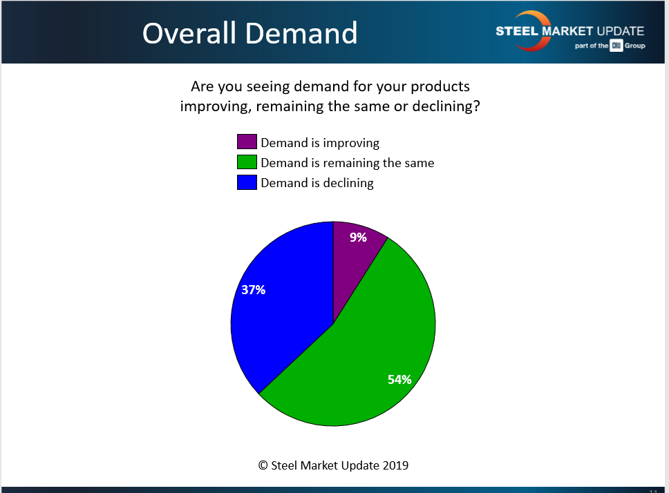 More than half of those responding to SMU’s market trends questionnaire on Monday and Tuesday said demand from their customers is flat or unchanged. Another 37 percent reported declining demand for their products. Less than 10 percent said they have seen improvement in demand.