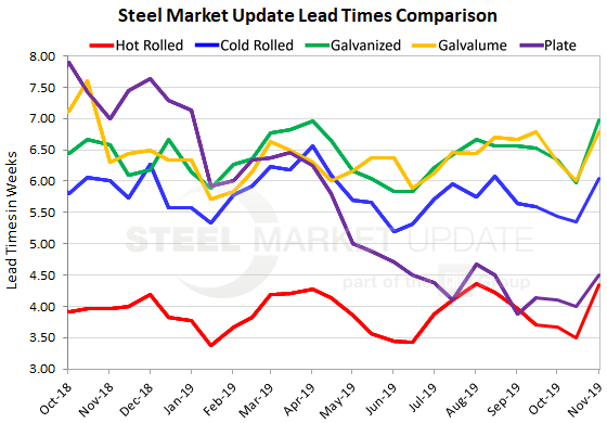 The average lead time for hot rolled is now up to nearly four and a half weeks, cold rolled is over six weeks and coated steels are nearly seven weeks. Plate lead times are up to four and a half weeks, according to data gathered by Steel Market Update on Monday and Tuesday of this past week.