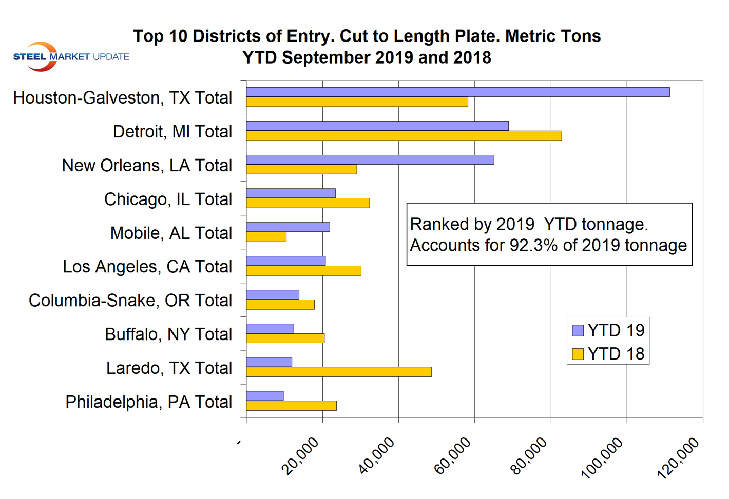 The table included here is a small part of the detailed analysis of the cut-to-length plate tonnage. And the bar graph shows the tonnage of CTL plate that entered the top 10 districts through September year to date for 2018 and 2019 ranked by 2019 tonnage. These 10 districts accounted for 92.3 percent of the total CTL plate tonnage in 2019 through September.