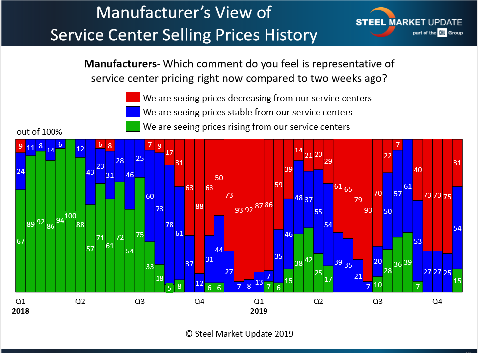Since the beginning of October, as many as 89 percent of service centers have reported lowering spot prices to their customers. Nearly the same percentage of manufacturers, 73-75 percent, confirmed the price cutting by their distributor sources (see Manufacturers View of Service Center Selling Prices History chart below).
