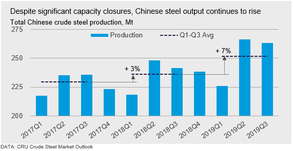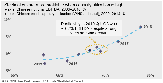 The investigation comes at a time when total crude steel production has reached an all-time high. Chinese crude steel output was 842 Mt in the first 10 months of this year, on an annualized basis, growing by 7 percent compared to the same period last year. In order to achieve this high output, given registered capacity levels, steel mill utilization rates would have been very high. In some cases, reported production has exceeded registered capacity so much that utilization would have been 150 percent. CRU believes greater production has been enabled by capacity expansion and productivity gains, enabled by the strong profitability for Chinese mills between the end of 2017 and late-2018. Much of these investments realized capacity increases in late-2018 and 2019, which have weighed on the sector’s profitability and attracted the government’s attention.