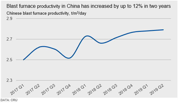 Increased productivity has also been a key source of stronger steel output. We have noticed an increase of blast furnace productivity at Chinese steel mills, by as much as 12 percent over the past two years (see chart below). This may be achieved by relining to allow larger internal furnace volume, investing in increased pulverized coal injection (PCI) and oxygen injection, and/or allowing for higher scrap usage in the furnace. Beyond the blast furnace, mills would have been investing across their supply chains, such as increasing the volume of BOF vessels through refractory changes and better management, installation of ladle furnaces, and re-motoring of rolling mills.