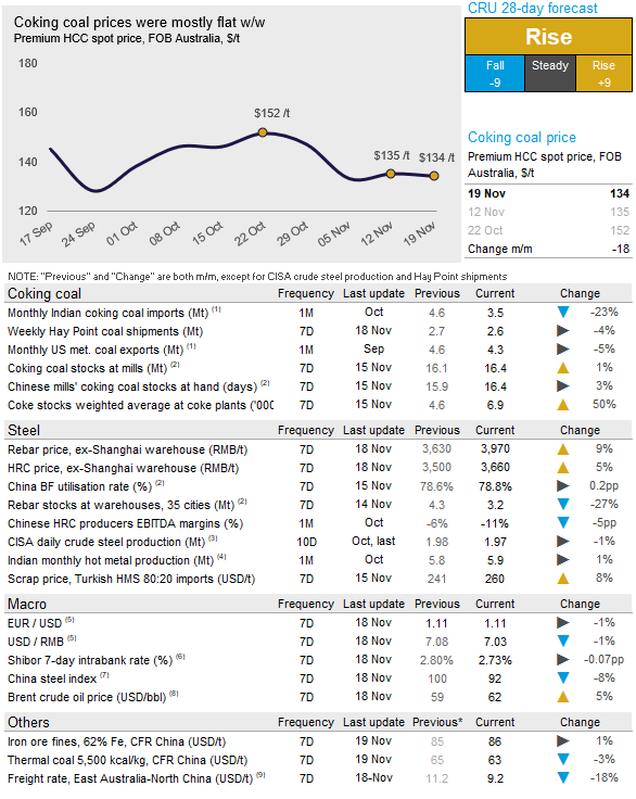 On Nov. 19, CRU assessed the Premium HCC $1 /t lower w/w at $134 /t, FOB Australia. We hold our view of a slight improvement in seaborne coking coal prices in the next month on expectations of restocking demand from India, coupled with weak shipments from Australia and mine safety inspections in China.