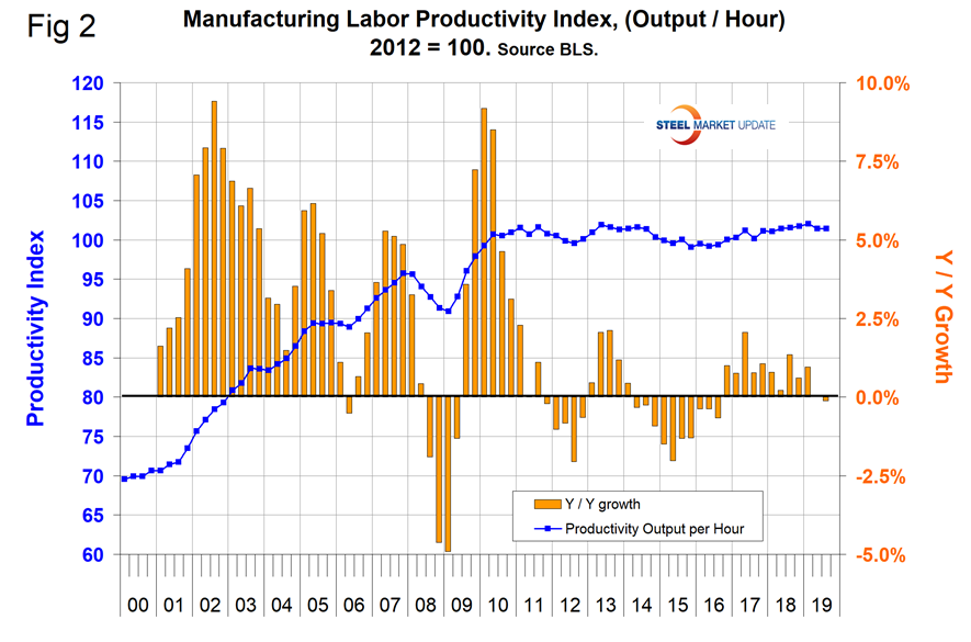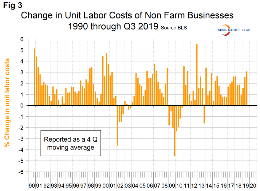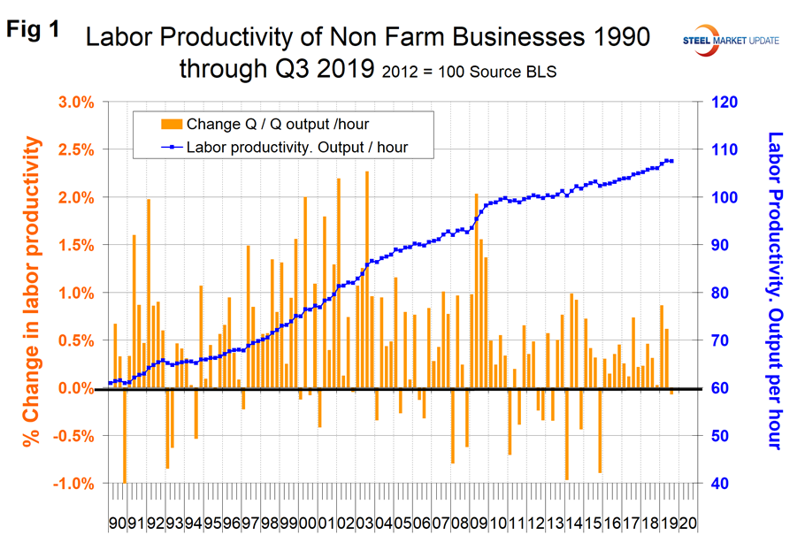 Unit labor costs and productivity changes are reported quarterly by the BLS and results for Q3 2019 were released last week. All quarterly percent changes in this release are seasonally adjusted annual rates. This basic information is useful to better understand the steel market. One way of looking at GDP is that it is the growth of the working age population multiplied by their productivity. Steel consumption is correlated with the growth of GDP.