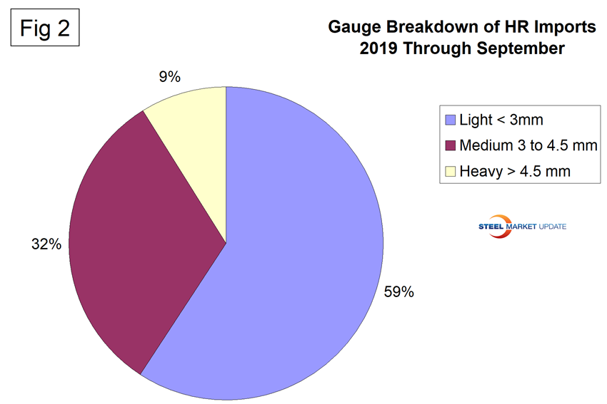 Through September 2019, of the total hot rolled sheet and strip imports into the U.S., only 5.6 percent was strip. By gauge range, the sheet broke down to: 59.3 percent < 0.3mm, 31.9 percent 3 to 4.5 mm, 8.9 percent > 4.5mm thick.