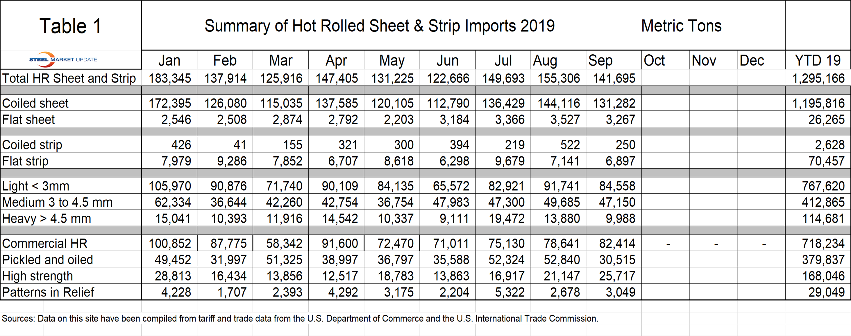 Table 1 is a summary for 2019 through September of hot rolled imports showing gauge ranges and condition and the annual year-to-date total for sheet and strip in metric tons.