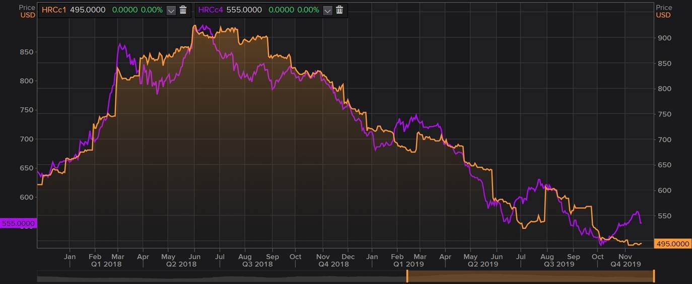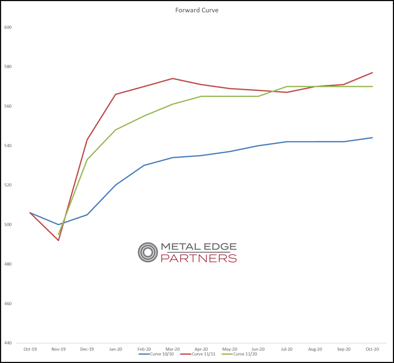 Over the past few days, it is possible that many of you have experienced dilemma, concern and doubts about the U.S. steel market and its impending direction. If the trend of the futures market is anything to go by, the confusion is best captured in the derivative arena. Futures’ prices have meaningfully appreciated since early October (blue line). The Q1 2020 prices up until 10 days ago had moved more than $40 in a month. Any trader long Q1 2020 futures at $528 (average Q1 on 10/10) would have made $42/ton on 11/11. Since then, however, the market has seen some renewed pressure. This pressure has largely been attributed to the question asked by many: Are we amidst another dead cat bounce?