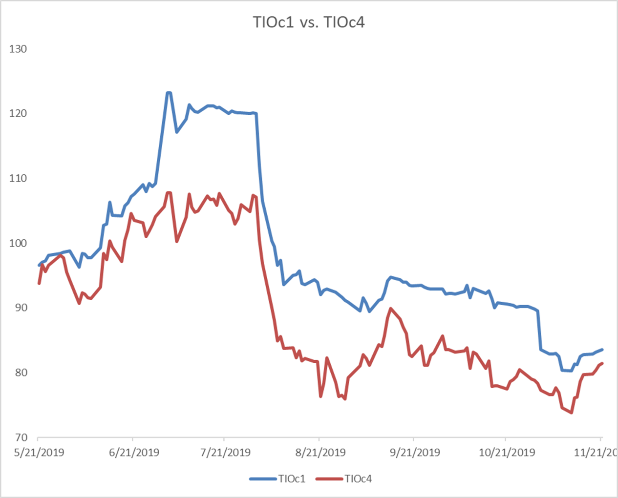 To analyze the question, the following chart adds some interesting perspective. The chart shows the 4th month futures price and that of the spot month. Loosely, it implies that the chart tracks the moving expectation of the market (its sentiment) for pricing 4 months out versus today’s price. To understand the chart better, when the purple line is above the orange line, the curve is in a contango (means the 4th month is priced higher than spot price) and when the purple line is below the orange line we are in backwardation (means current price is above the price 4 months out).