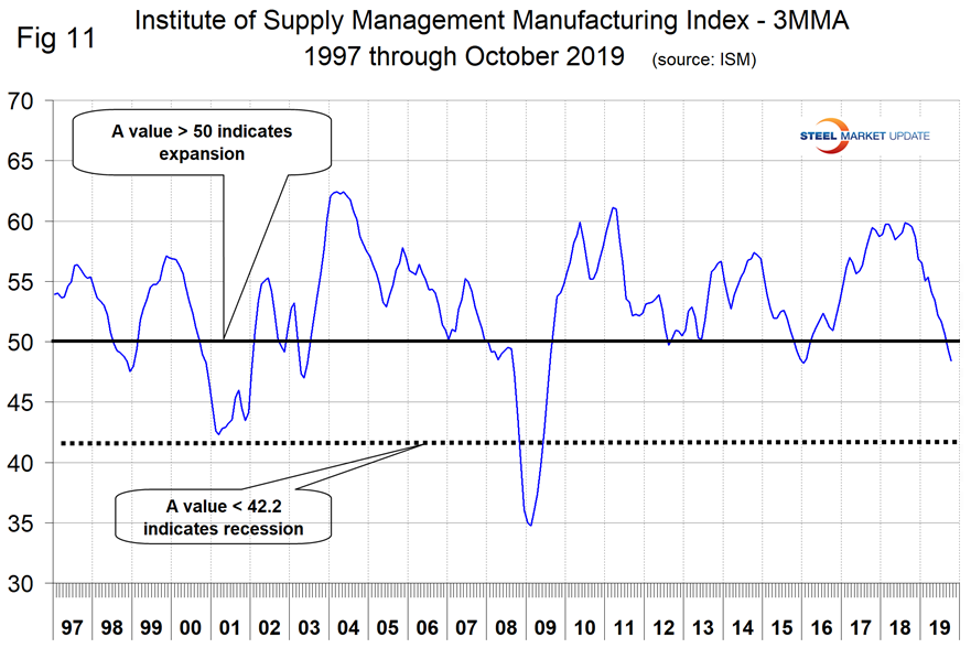Figure 11 shows the 3MMA of the ISM index from January 1997 through October 2019. The index surged from January 2016 through October 2017, leveled off through October 2018 and has declined since then. The index had a value of 48.3 in October with a 3MMA of 48.4. The 3MMA was down by 11.1 points year over year. August was the first month for the 3MMA of the index to be below 50 since March 2016.