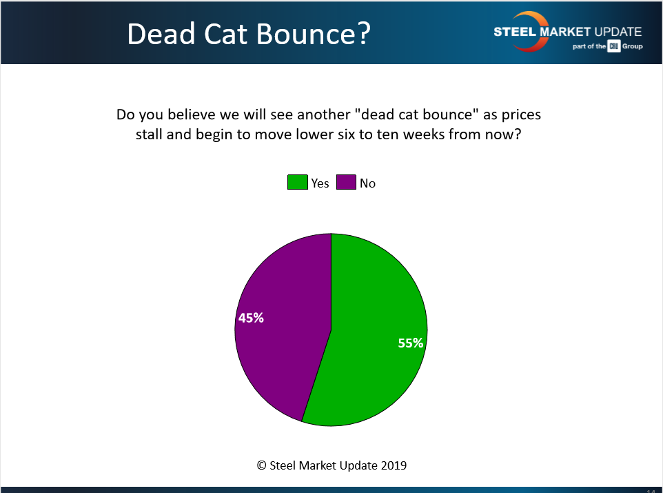 Steel Market Update asked: Do you believe we will see another “dead cat bounce” as prices stall and begin to move lower six to ten weeks from now? Slightly more than half (55 percent) said yes, slightly less than half (45 percent) said no.