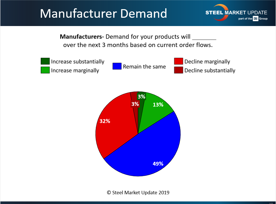 Nearly half of the manufacturers responding to Steel Market Update’s market trends questionnaire this week reported demand from their customers as about the same. Only 16 percent said demand is improving. Thirty-five percent said they see declining demand in their market.