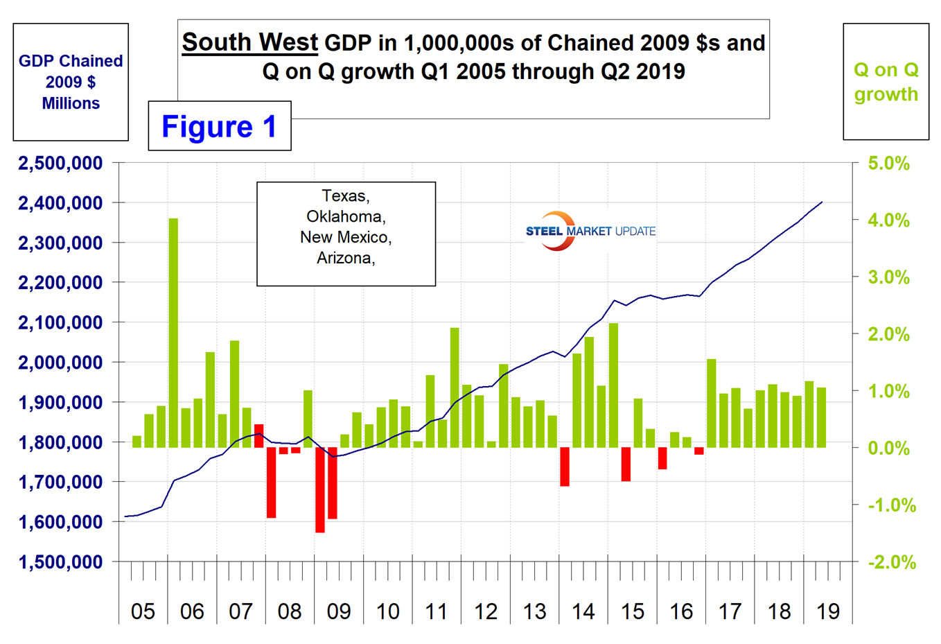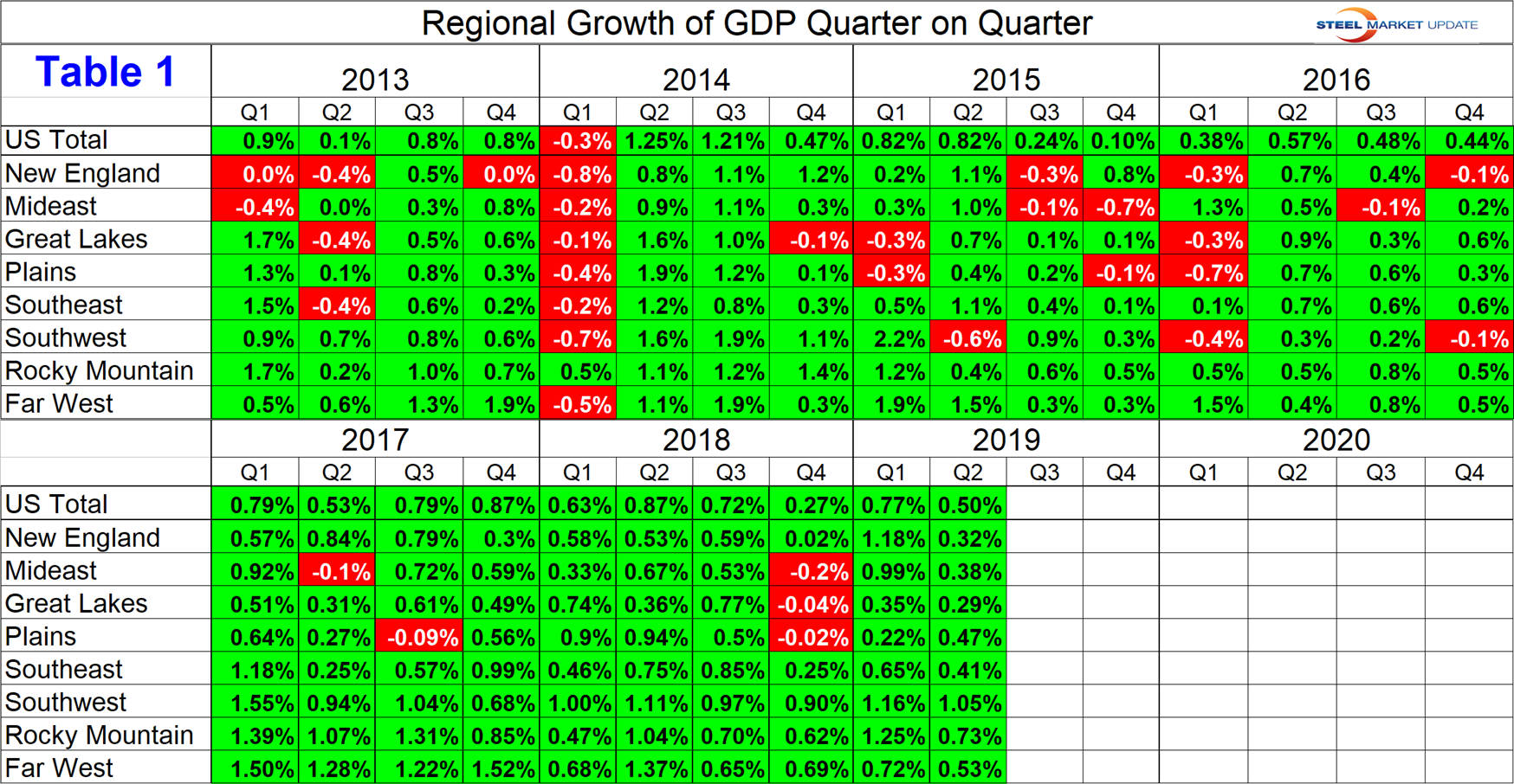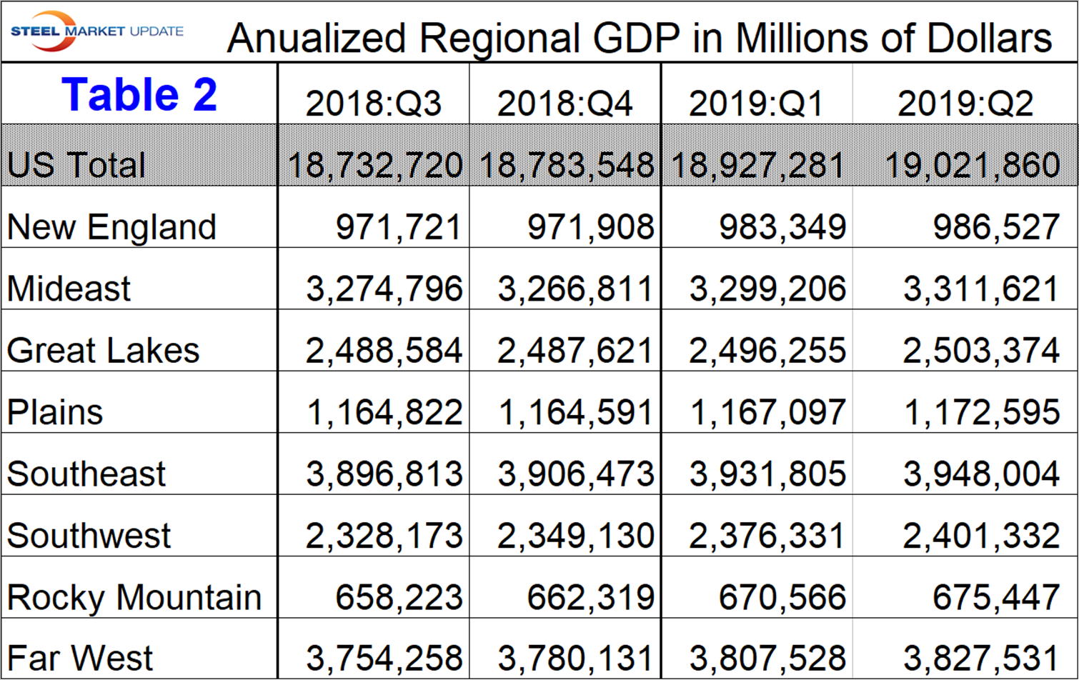 The BEA reports GDP by state and region on a quarterly basis. This data is released several weeks after the national report. The latest data was updated through Q2 2019. Even though this might be considered historically “old,” we think it’s worth reporting because it’s the foundation for where we are now. The data is reported in chained 2012 dollars seasonally adjusted. Steel Market Update analyzes the data and reports to subscribers quarterly by region. Table 1 shows the growth of regional GDP quarter on quarter. (These growth numbers are not annualized as opposed to the headline number for the growth of national GDP. Annualized means multiplied by four.) Every region had positive growth in each of the first two quarters of 2019 with the South West having the highest growth YTD at 2.2 percent followed by the Rocky Mountains at 2.0 percent