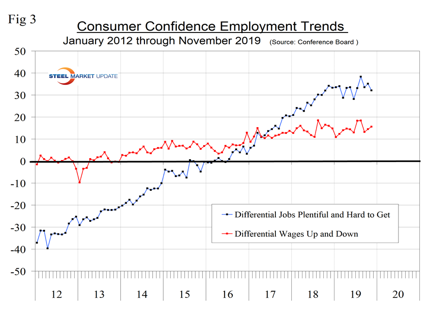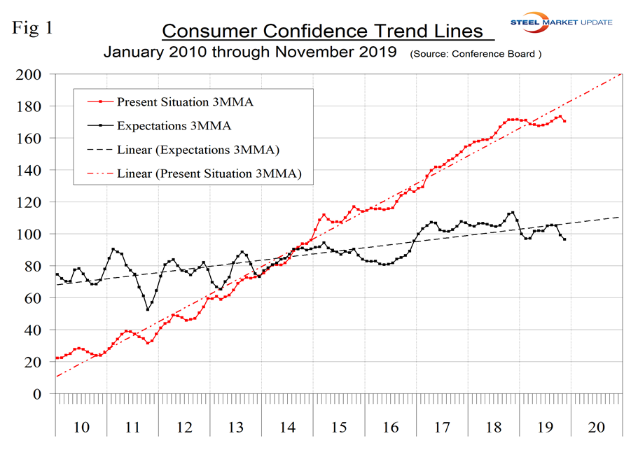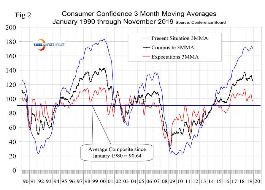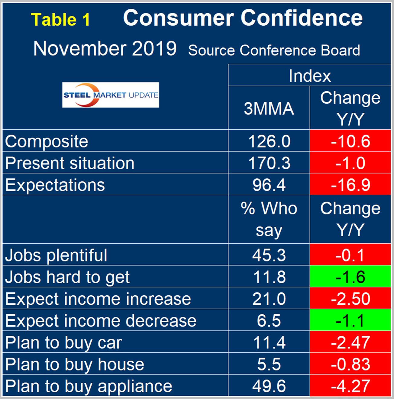 SMU Comment: The Conference Board Consumer Confidence Index is a volatile measure and must be reviewed as a three-month moving average to obtain a realistic view of trends. The consumer’s view of the present situation is still good, but based on Table 1, the September through November results show an increased weakening of confidence year over year led mainly by worsening expectations. Purchase plans for autos, houses and appliances all declined in November.
