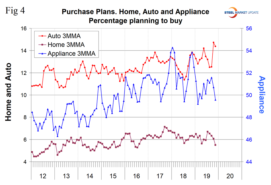 Consumer spending attitudes in November indicated that year-over-year plans to buy a car on a 3MMA basis declined to the lowest level since December 2015. Plans to buy an appliance declined substantially in October and November and plans to buy a house have declined in each of the last four months (Figure 4).