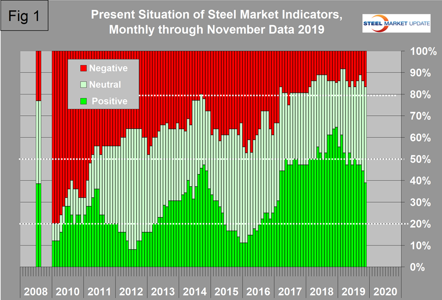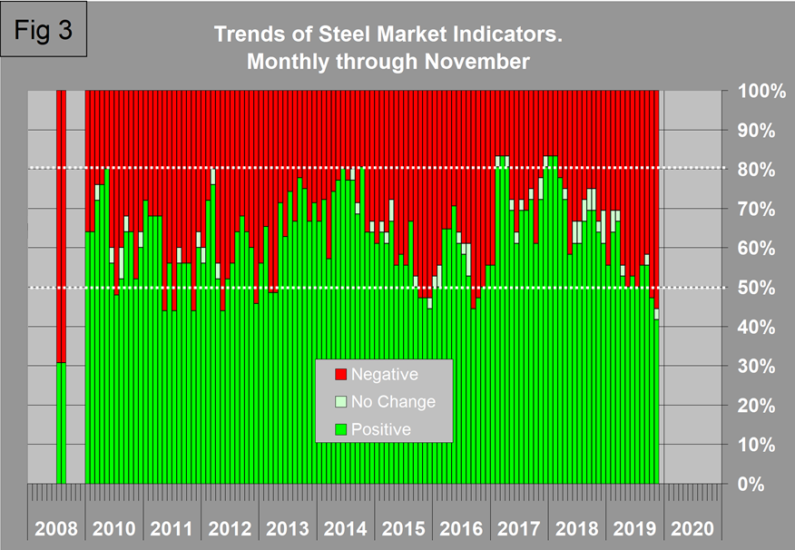 We believe a continued examination of both the present situation and direction is a valuable tool for corporate business planning. Figures 1 and 3 both show the pre-recession situation in November 2008. The trends analysis shows that the steel market was going over a cliff at that time, but the actual values of the indicators were still good with only 23 percent registering as historically negative. As of November, there is currently a definite deterioration in the direction of trends that has been remorseless since the beginning of 2018. The number of indicators trending positive is now the lowest since we began this analysis in January 2010. Our view of the current situation is still quite good though the number of indicators having a historically high value has deteriorated since the end of 2018.