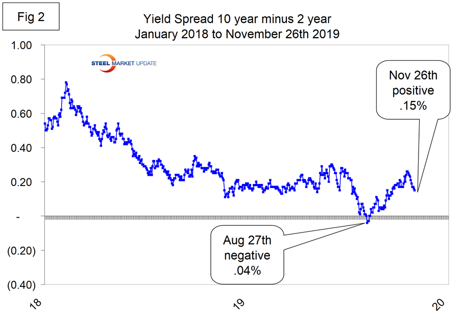 We make special mention of the Treasury yield spread here because the 10-year minus two-year dipped into negative territory for three days at the end of August. Historically, a negative yield spread has been a predictor of recession within 18 months. On Nov. 26, the value was positive 0.15, which was a deterioration from 0.21 percent a month ago (Figure 2). The negative duration was so short and the negativity so small that maybe we have dodged the recession prediction for now. The last time the 10/2 spread was negative was June 6, 2007.