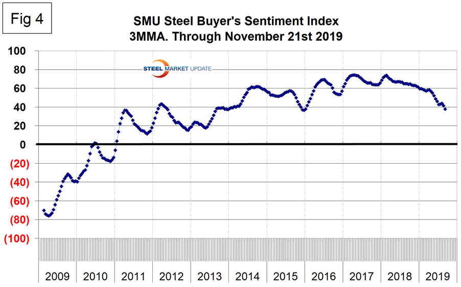 As a reality check for this report, we include here Figure 4, which is SMU’s Steel Buyers Sentiment index. Readings are developed during the twice monthly SMU market surveys. SMU Steel Buyers Sentiment is a measure of the current attitude of North American buyers and sellers of flat rolled products regarding their company’s opportunity for success in today’s market. A reading above the neutral point of zero indicates that a preponderance of buyers have a positive attitude. The index has been deteriorating since mid-February last year. As a single data point, the Current Sentiment reading of +47 is up more than 20 points from early November. While showing more optimism about current market conditions, the reading is still 18 points below the level at this time last year. On a 3MMA basis, the mid-November value was positive 37.8, down from 41.3 in mid-November and from a peak of 73.8 in February 2018.
