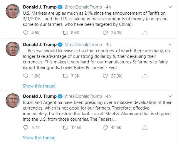President Trump sent three tweets this morning that said, effective immediately, he would restore the steel and aluminum tariffs on Brazil and Argentina because the countries “have been presiding over a massive devaluation of their currencies, which is not good for our farmers.” No formal announcement has been made on the White House website.
