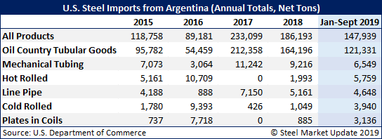 Argentina is a small exporter of steel to the United States having only exported 186,193 net tons of steel products to the U.S. during calendar year 2018. Through September, Argentina has exported 147,939 net tons. The bulk of the exports are oil country tubular goods (OCTG).