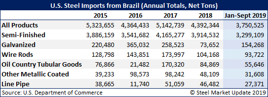 Brazil has an annual quota of 3.5 million metric tons on semi-finished steels (slabs, billets, blooms) into the United States. The quota has been filled for fourth-quarter 2019, and inventories are building in bonded warehouses now for material to be released as part of the first-quarter 2020 quota. As of this writing, none of the affected mills are quite certain how the president’s tweet will impact their company.