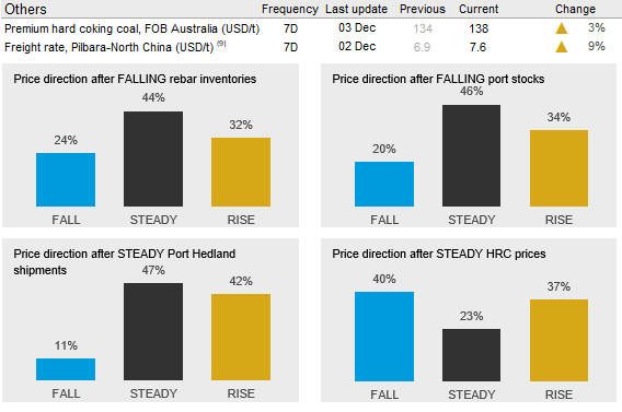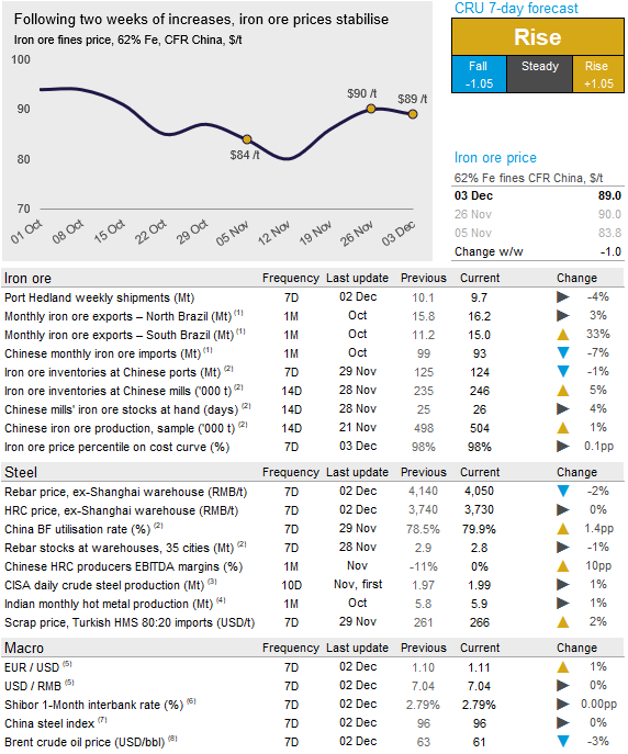After two weeks of increases, iron ore prices moved marginally lower this week by $1 /t w/w as CRU has assessed the 62% Fe fines price at $89 /t, CFR China. The end of the upward momentum in iron ore prices was primarily the result of the change in direction in Chinese domestic steel prices over the past week. Following the sharp increases through November for both rebar and HR coil, over the past week rebar prices declined by 2.2 percent w/w, while HR coil prices remained unchanged w/w. These changes were mainly the result of weakening construction activity in northern China due to cold weather, as well as rising supply.