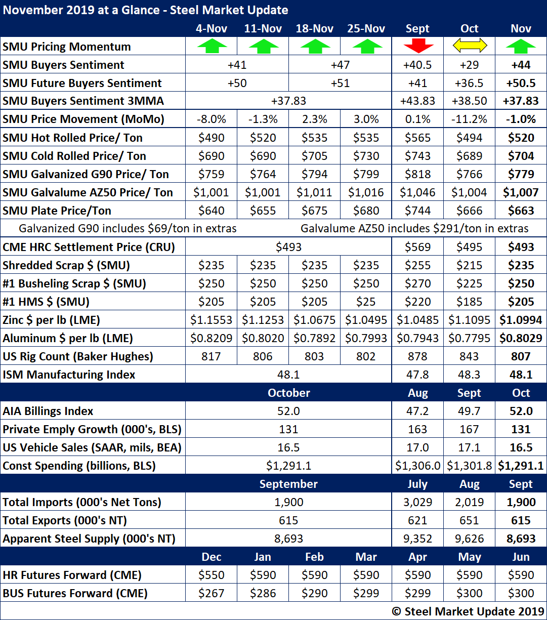 Steel prices had upward momentum in November following multiple price increase announcements by the mills on flat rolled and plate products. Steel Buyers Sentiment moved upward along with the prices as service centers and OEMs anticipated a strengthening market.