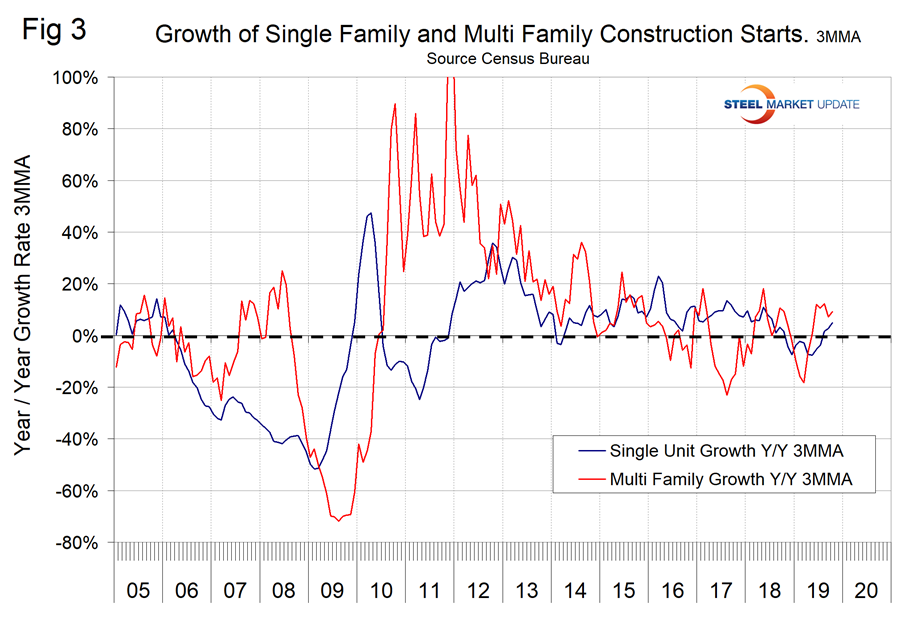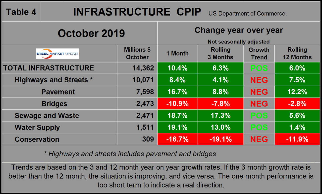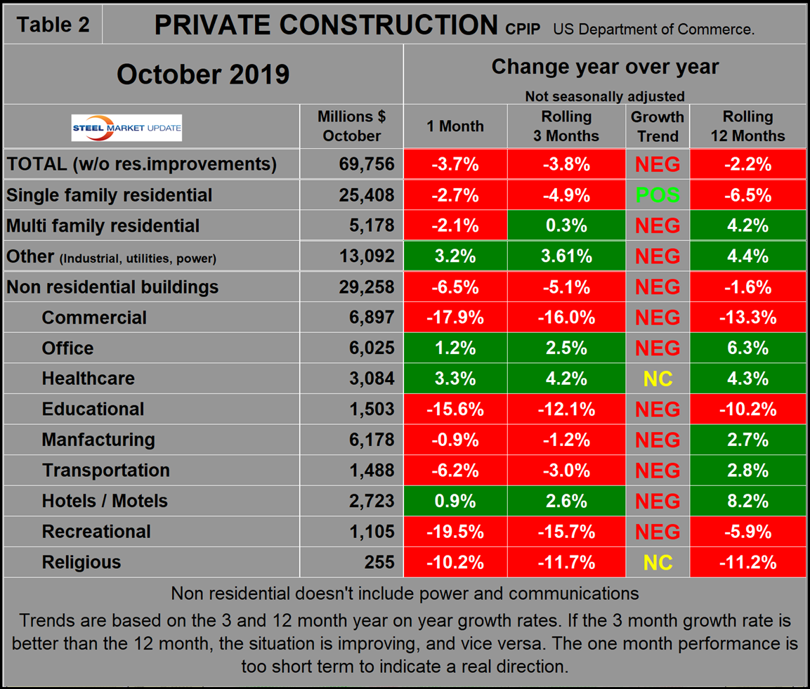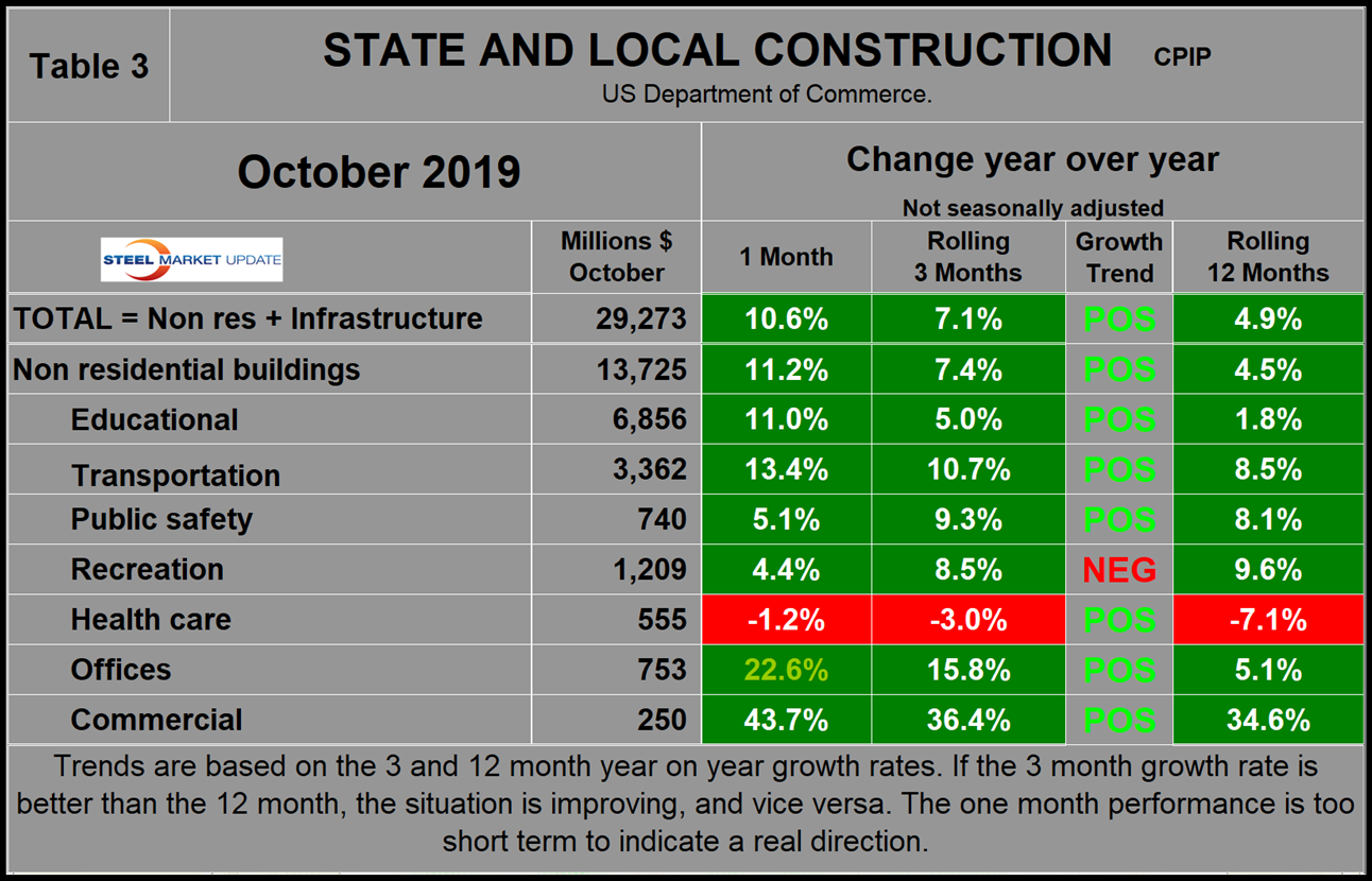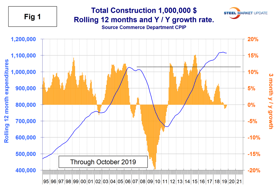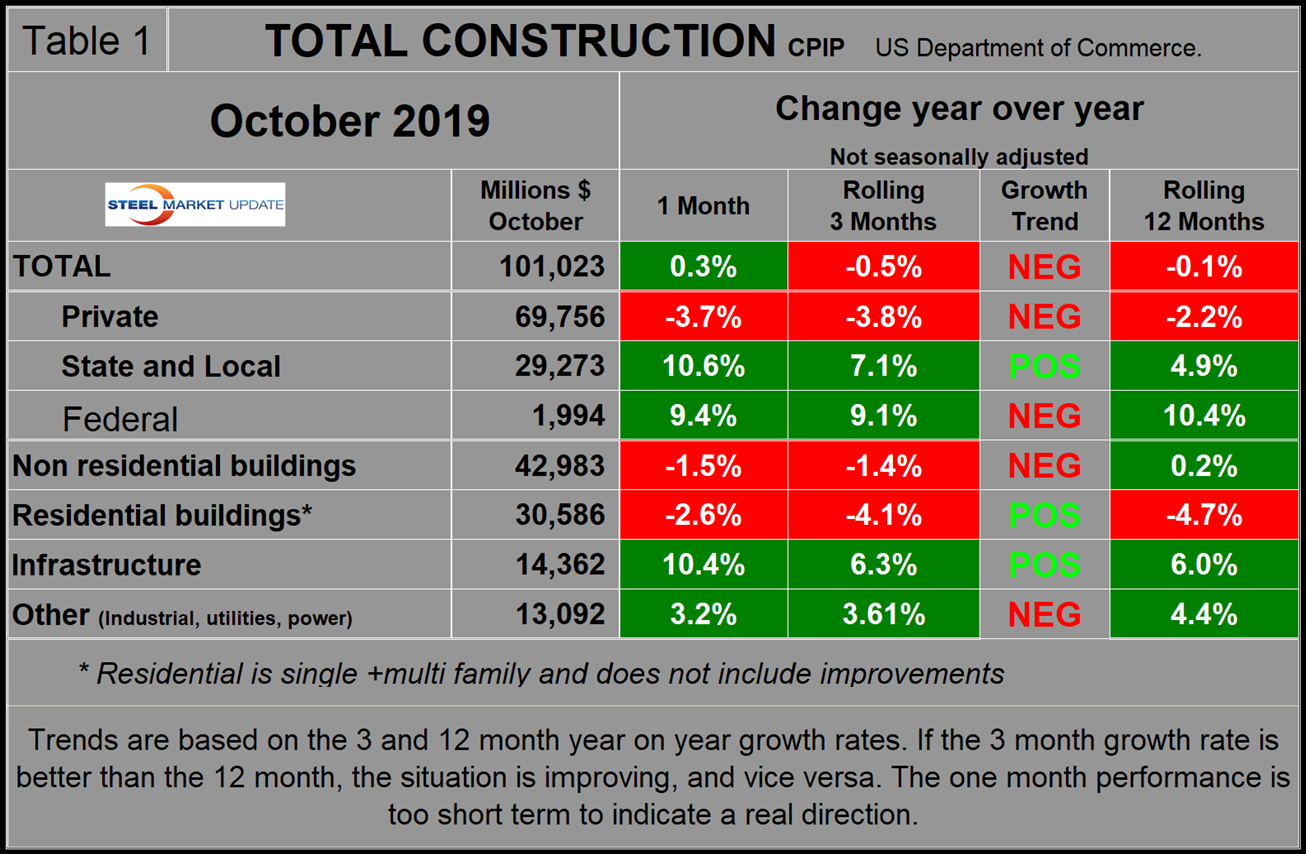 The official CPIP press release gives no appreciation of trends on a historical basis and merely compares the current month with the previous one on a seasonally adjusted basis. The background data is provided as both seasonally adjusted and non-adjusted. The detail is hidden in the published tables, which SMU tracks and dissects to provide a long-term perspective. Our intent is to provide a route map for those subscribers who are dependent on this industry to “follow the money.” This is a very broad and complex subject, therefore, to make this monthly write-up more comprehensible, we are keeping the information format as consistent as possible. In our opinion, the absolute value of the dollar expenditures presented is of little interest. What we are after is the magnitude of growth or contraction of the various sectors. In the SMU analysis, we consider only the non-seasonally adjusted data. We eliminate seasonal effects by comparing rolling three-month expenditures year over year. CPIP data also includes the category of residential improvements, which we have removed from our analysis because such expenditures are minor consumers of steel.
