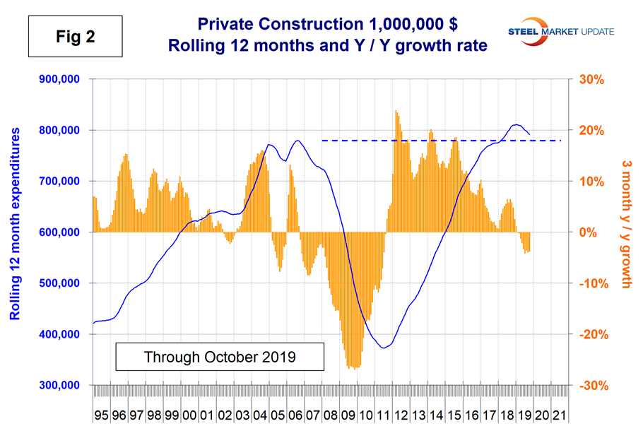 Figure 1 shows total construction expenditures on a rolling 12-month basis as the blue line and the rolling three-month year-over-year growth rate as the brown bars. Total construction on a rolling 12-months basis through April was at an all-time high, but declined each month through October. The brown bars show growth on a 3MMA basis year over year and became negative in June through October for the first time since November 2011.