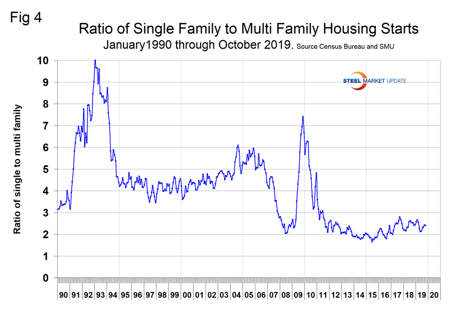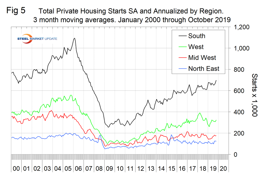 Excluding property improvements, single-family residential contracted by 4.9 percent in three months through October with positive momentum, while multifamily residential grew by 0.3 percent with negative momentum. Total housing starts as reported by Census Bureau expanded by 6.1 percent in three months through October. In the starts data, the whole project is entered into the database when ground is broken. Construction Put in Place is based on spending work as it proceeds; the value of a project is spread out from the project’s start to its completion. Single-family starts expanded by 4.9 percent in the three months through October year over year. August through October were the first months with positive growth since September last year. Multifamily starts expanded by 9.2 percent. Both the single-family and multifamily starts data were better in October than the CPIP result. Figure 3 shows the growth of both housing sectors since January 2005 and Figure 4 shows the ratio of single-family to multifamily starts. The proportion of single-family gradually increased from January 2015 when the ratio was 1.66 in favor of single units to 2.40 in October 2019. Figure 5 shows total housing starts in four regions with the South being the strongest and the Northeast the weakest. On a 3MMA basis, the National Association of Home Builders optimism index improved every month from January through October this year.