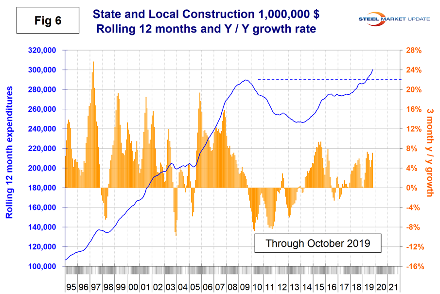 The growth rate of S&L work was in the range of 4.0 to 6.9 percent for the six months through September, but broke out to the upside in October at 7.1 percent (Table 3). This includes both infrastructure and nonresidential buildings. S&L nonresidential buildings had negative momentum each month from November 2018 through July 2019 and became positive in August through October with a 7.4 percent growth rate in October. Educational is by far the largest subsector of S&L nonresidential buildings at $6.9 billion in October and expanded at a 5.0 percent rate in three months through October with positive momentum. Figure 6 shows the history of total S&L expenditures.