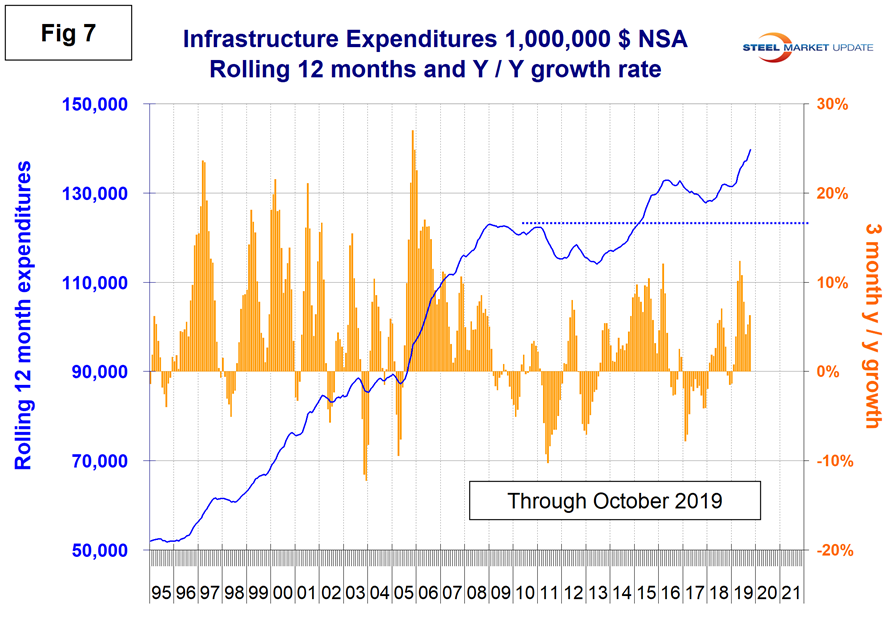 Figure 7 shows the rolling 12-month history of infrastructure expenditures and the year-over-year growth rate.