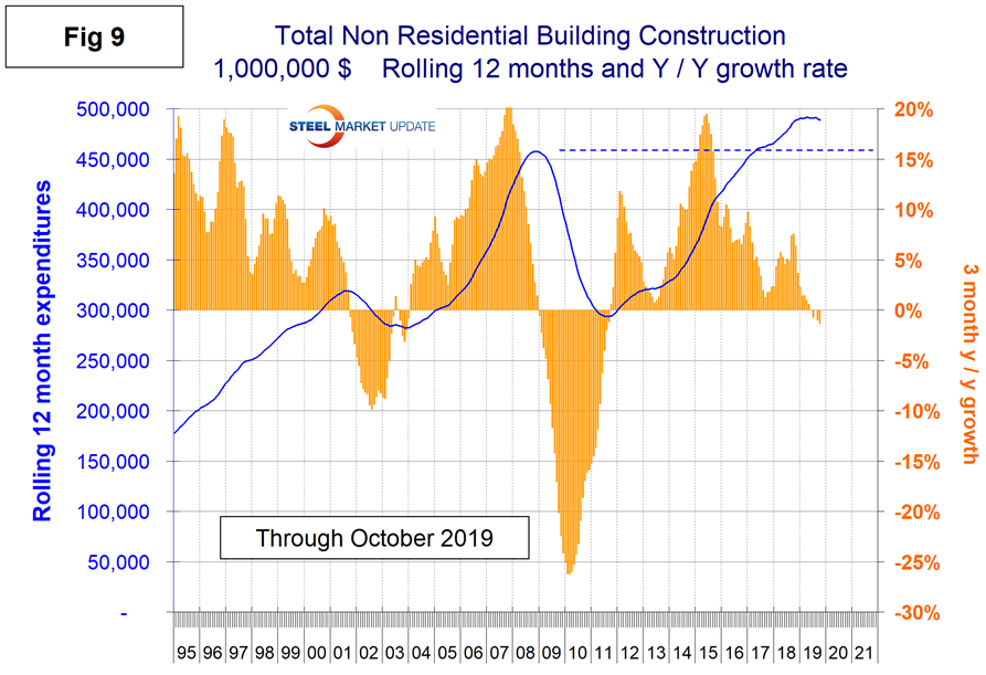 Figure 9 shows total expenditures and growth of nonresidential building construction. On a rolling 12-months basis, expenditures on nonresidential buildings were at an all-time high in April this year. The growth rate has declined in each of the last six months reaching negative 1.4 percent in October. July through October were the first months for nonresidential building construction to contract since September 2011.