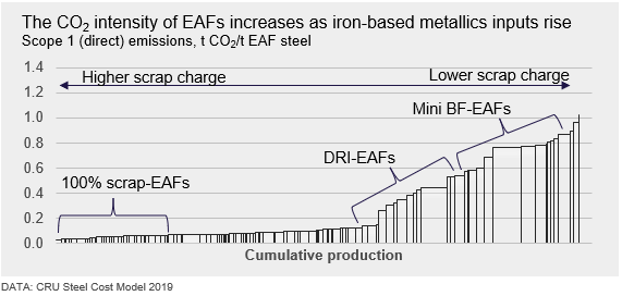 The amount of CO2 a facility emits, and the CO2 intensity of the steel produced, is directly proportional to the amount of carbon that enters a facility. The 100 percent scrap-based EAFs produce steel with the lowest CO2 intensity as the carbon inputs are mostly in the form of graphite electrodes, natural gas and small quantities of injection coal for slag foaming. Carbon is also contained in iron-based metallics, such as pig iron and DRI/HBI, and, as the proportion of iron-based metallics increases, so too does the CO2 intensity of EAF steel production. In BF-BOF steelmaking, carbon in the form of coal and coke is the primary contributor to CO2 emissions.