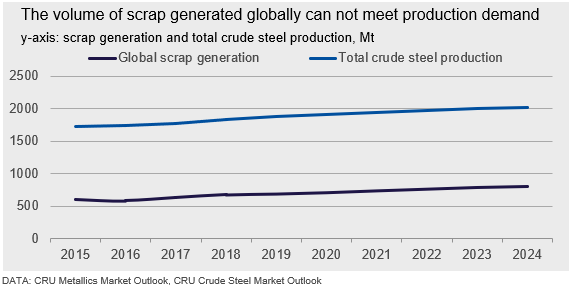 On a global basis there is not enough scrap generated to meet the demand for crude steel; the difference is estimated to be over 1 Bt. When yield losses are factored in, the gap between scrap generation and crude steel production widens further.
