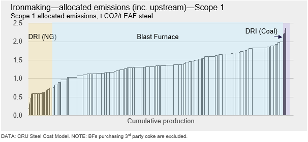 Below is a chart showing CRU’s Ironmaking Carbon Curve. This chart combines emissions from blast furnaces, DRI and Corex units covered in the cost model. The total emissions intensity is highly dependent on the reducing agent (i.e. coal, coke or natural gas) used in each ironmaking process, the plant efficiency and the calorific value of the coal used.