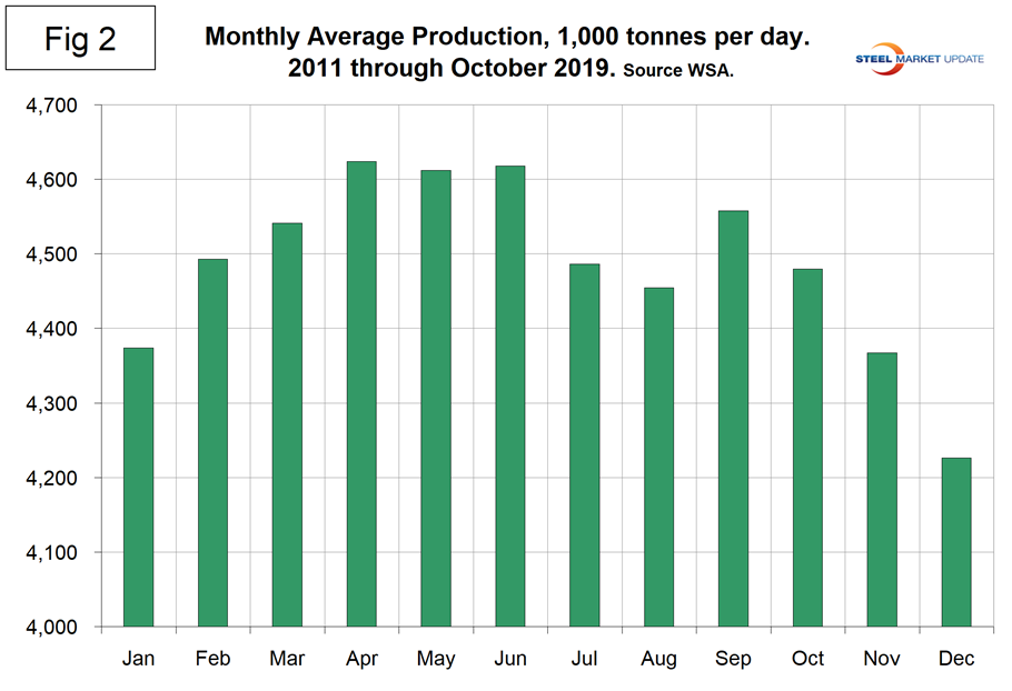 On average, global production on a tons-per-day basis peaked in the early summer in the years 2010 through 2016, but in 2017 and 2018 the second half downtrend was delayed until the fourth quarter. This year seems to have reverted to the norm with peak production in June. Figure 2 shows the average tons per day of production for each month since 2011. On average, October declined by 1.72 percent from September. This year October decreased by 2.98 percent.