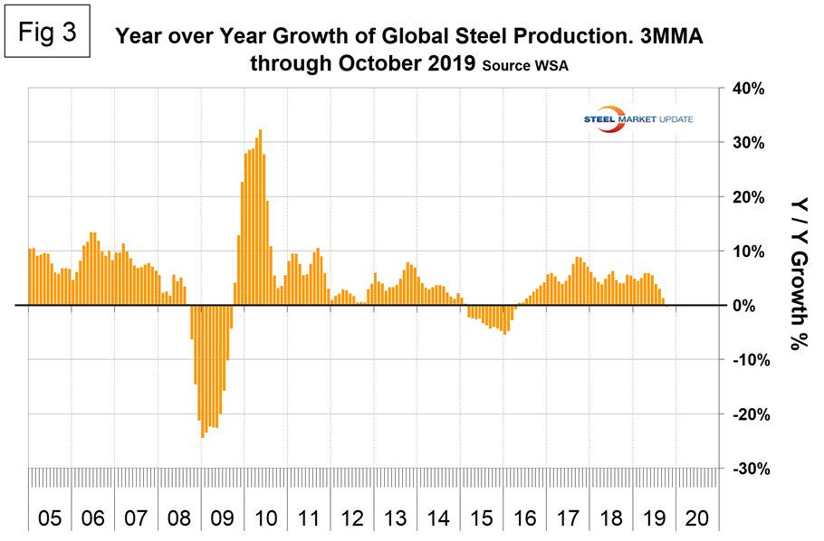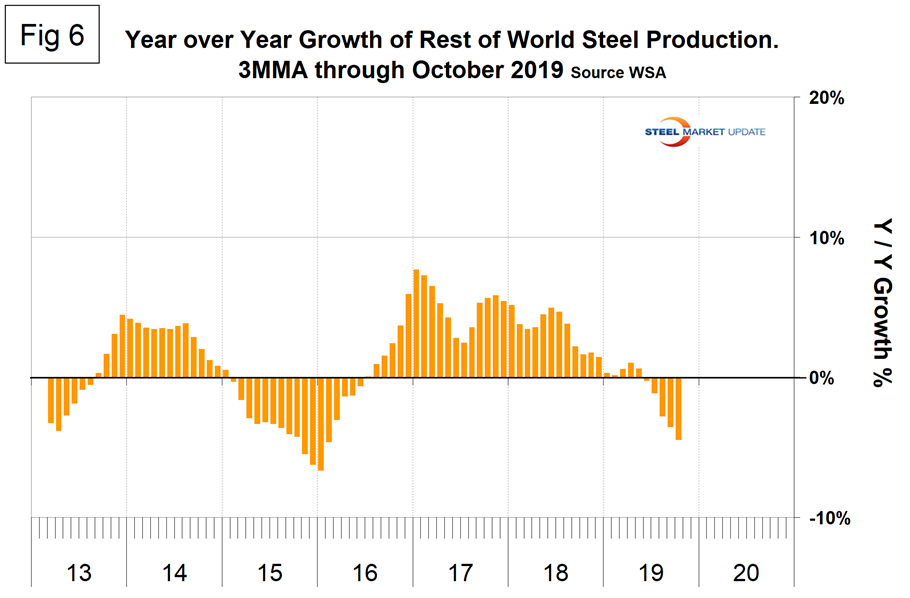 Figure 3 shows the year-over-year growth rate of the 3MMA of global production since January 2005. Growth in three months through October was negative 0.3 percent, down every month from 5.8 percent in April and May. This was the first negative growth month since March 2016. China had positive growth in October. The rest of the world growth of steel production was negative 4.5 percent in three months through October.