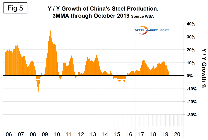 Figure 4 shows China’s production since 2005. As just stated, global steel production was down by 0.3 percent in three months through October year-over-year and China was up by 3.4 percent, both with negative momentum. The updated OECD data shows China’s capacity in 2018 to be 1,023,400,000 metric tons, while the WSA reported China’s production last year to be 924,752,000 metric tons, which yields a capacity utilization of 90.4 percent. That calculation doesn’t work for 2019 production because we don’t know the current capacity.