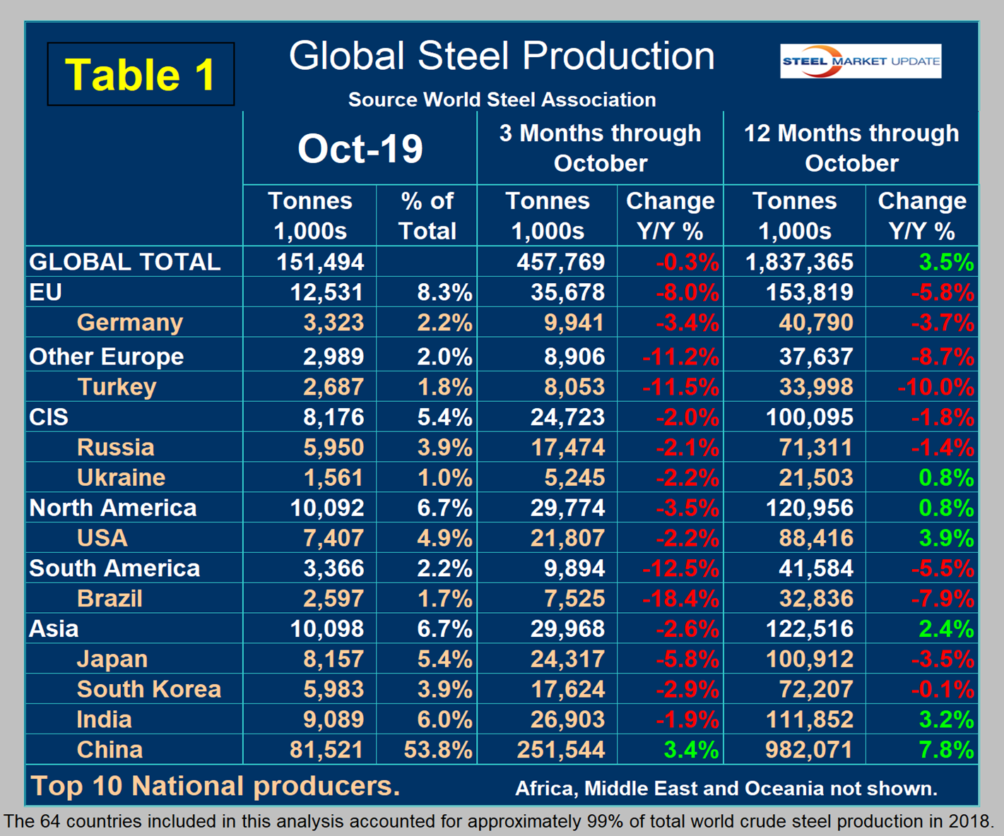 SMU Comment: This analysis is based on data made public monthly by the World Steel Association. It is our impression that the WSA has been overly optimistic recently about future global steel production. China is slowing but the rest of the world is slowing faster. The U.S. had one of the least negative growth rates in three months through October on a year-over-year basis.