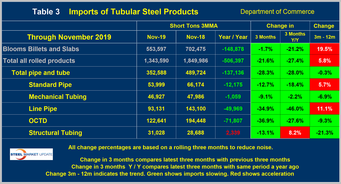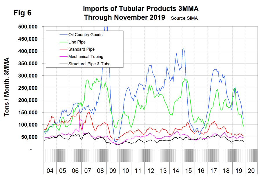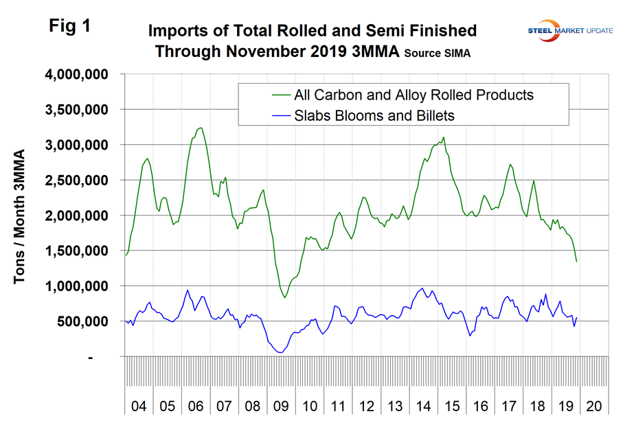 Imports of total rolled products in November were the lowest since February 2010 on both a single-month and a 3MMA basis. In the 12 months August 2018 through August 2019, total rolled product imports on a 3MMA basis were consistently in the range of 1.70 to 1.94 million tons. The September, October and November total rolled product volumes broke out of that range to the downside at 1.65, 1.53 and 1.34 million tons, respectively. Year over year on a 3MMA basis, sheet products were down by 28.4 percent, plate products were down by 43.6 percent, long products were down by 15.4 percent and tubulars were down by 28.0 percent. Imports of flat rolled, tubulars and longs all had a recent peak in May last year. Since then total flat rolled (sheet + plate) imports have consistently declined, which may be tariff-driven. This is not so obvious for longs and tubulars where the decline since May 2018 has been less consistent.